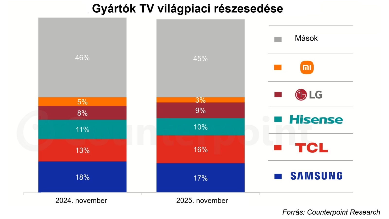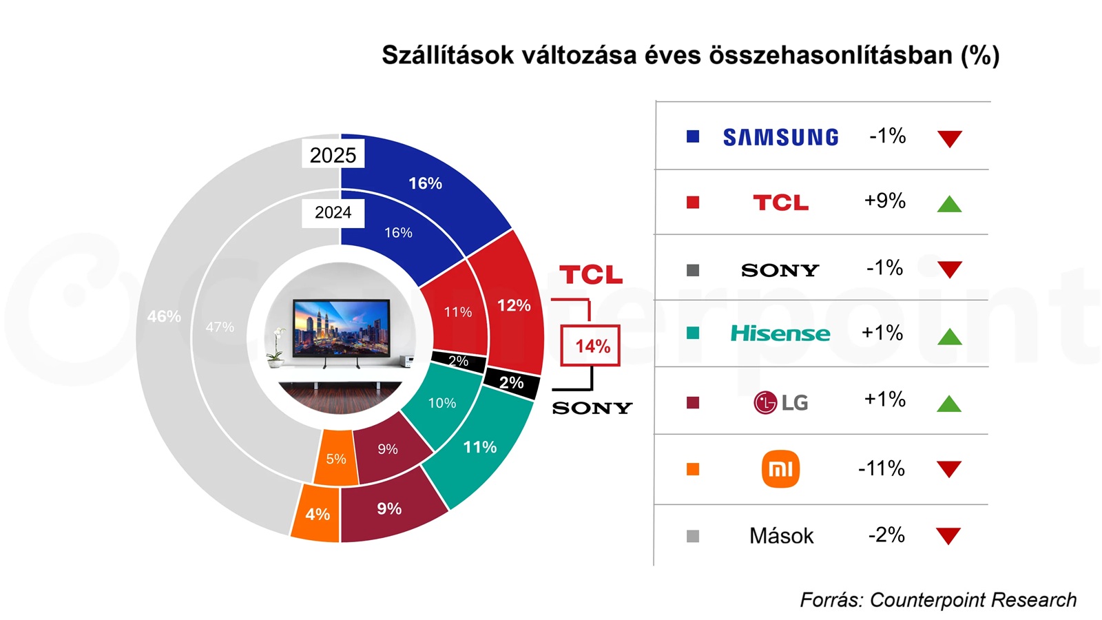 Nem újkeletű, hogy a Hisense és a TCL a Samsung TV piaci trónjára törnek, és 2025 novemberében a TCL már nagyon közel került a piacvezetőhöz egyetlen százalékpontra csökkentve részesedési lemaradását. A Counterpoint Research globális TV-kiszállítások havi követése szerint a TCL kiszállításai éves összevetésben (Év/Év) 22%-kal nőttek az 1%-kal zsugorodó TV világpiacon.