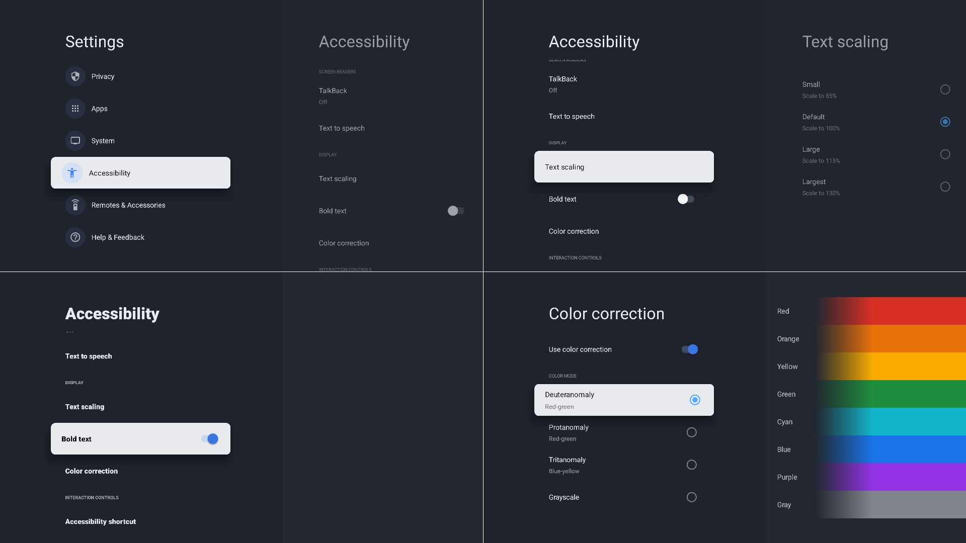 Az „Accessibility”, azaz a megjelenés kisegítő lehetőségeit tartalmazó menüpont a „Rendszer” almenü alól az Android TV 14 „Beállítások” menüjének legfelső szintjére kerül, és újdonságként megváltoztatható a szöveg mérete (Text scaling), félkövérre (Bold text) kapcsolható és például a színtévesztők alternatív színmódot és szürkeskálát választhatnak a színkorrekció (Color correction) alatt.
