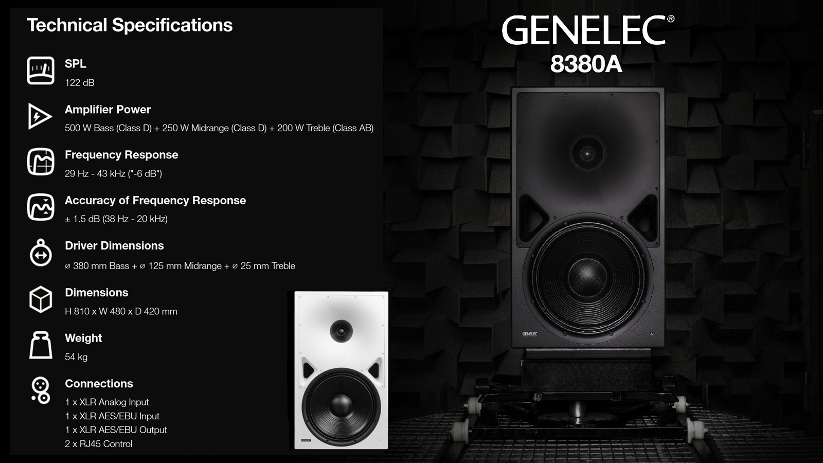 A Genelec által bejelentett 8380A új háromutas középtávolságú lehallgatásra szolgáló Smart Active Monitoring (SAM™) fő monitor a nagy testvér 8381A mellett a „The Main Ones” termékcsalád második tagja. A precíz hangkép és semleges hang reprodukálására tervezett 8380A a magas hangnyomásszintet igénylő közepes és nagyobb lehallgatóhelyiségek számára ideális választás, legyen az egy professzionális felvételi, keverő vagy „mastering” stúdió, illetve egy nagyon igényes otthoni hangrendszer.