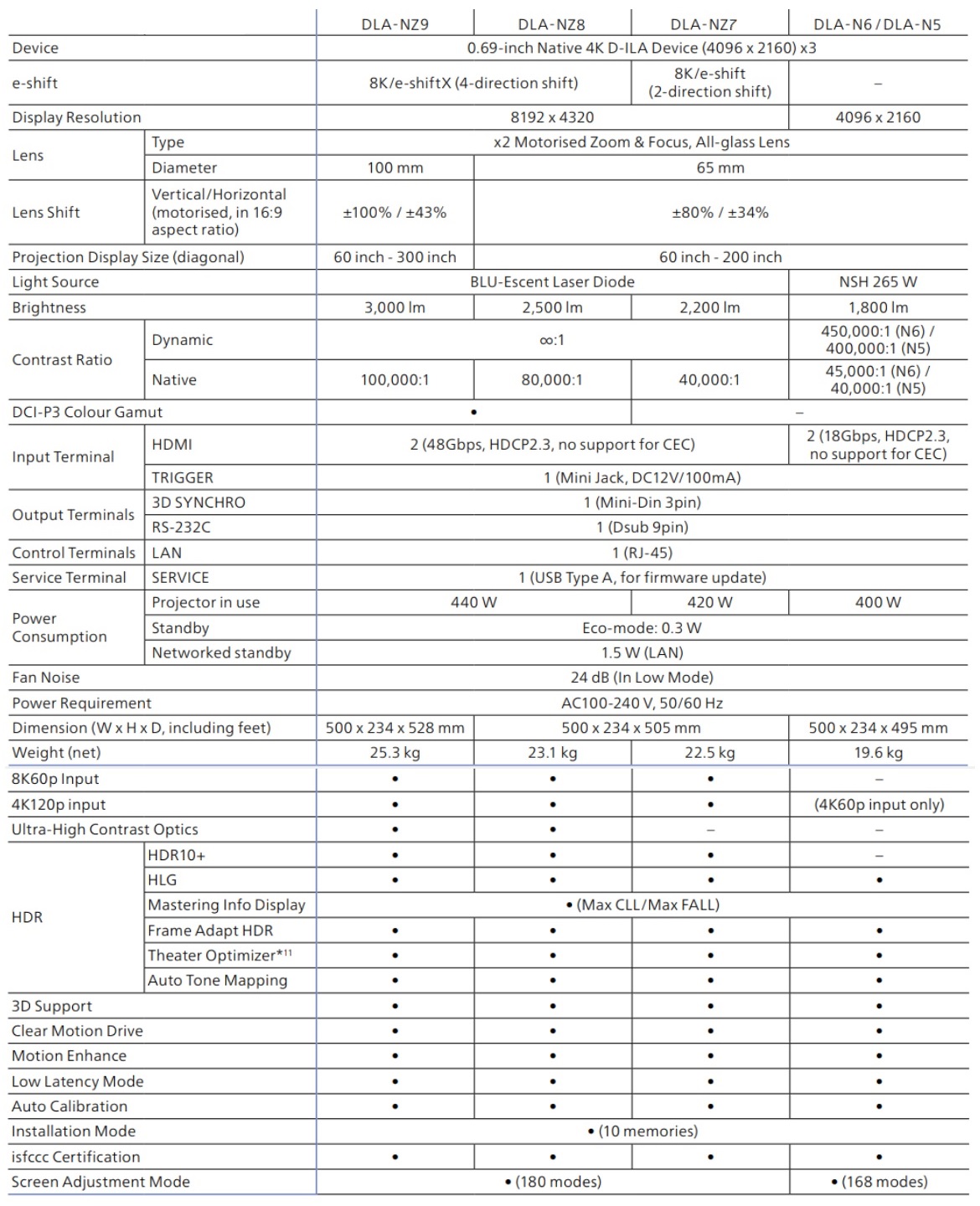Az új DLA-NZ9, DLA-NZ8 és DLA-NZ7 (illetve a márka professzionális termékeinek kínálatában DLA-RS4100, DLA-RS3100 és DLA-RS2100) az első olyan projektorok, amelyek teljes 48 Gigabit/sec sebességű HDMI 2.1/HDCP 2.3 bemenettel rendelkeznek. Mindhárom projektor fogadhat akár 8K/60 Hz-es videojeleket, támogatja a 4K/120 Hz-es játékot az új konzolokról, és új LSI chippel rendelkezik ezekhez a bemeneti jelekhez és a videoprocesszáláshoz.