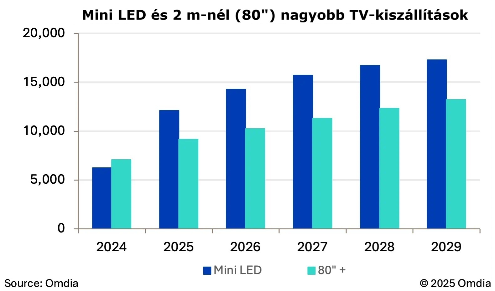 A piackutató Omdia sajtóközleményében a cég negyedéves tévépiacot figyelő új elemzésére hivatkozva azt várja, hogy a TV-k világpiacán a kiszállítások csak minimálisan, a 2025-ös 209 millió készülékről, 211 millióra növekszenek majd 2029-ben. A 2 méter (80 hüvelyk) feletti „ultra nagy” képernyőjű TV-k szegmense azonban várhatóan 44%-kal bővül 2025 és 2029 között, ami 10%-os kombinált éves növekedési rátát jelent. Ezt az ultra nagy LCD TV-k árának csökkenése és a panelmegvilágítási-technológia fejlődése együtt eredményezik majd.