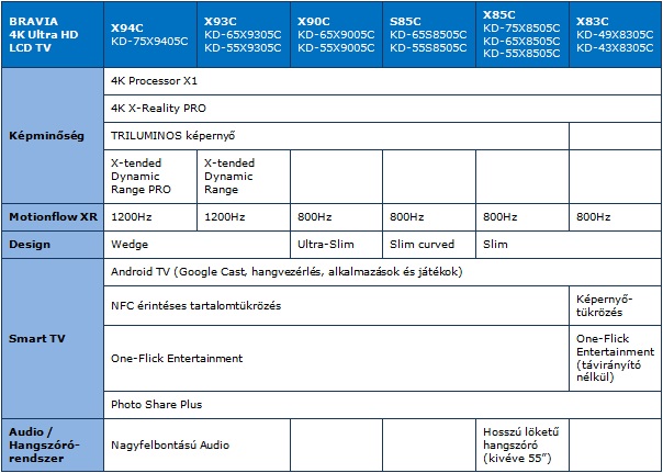 A Sony 2015-ben hat új 4K Ultra HD TV széria készülékeivel lép piacra Európában, melyek közül a legolcsóbb az X83C, a csúcsmodell pedig az X94C sorozatba tartozó KD-75X9405C. A Sony ívben hajlított képernyőjű S85C sorozatú TV-ket, és az X85C, X90C valamint az X93C szériákban további síkpaneles modelleket is kínál. Az összes európai 4K Ultra HD TV két vevővel (tuner) rendelkezik, a Full HD modelleknek viszont egyike sem.