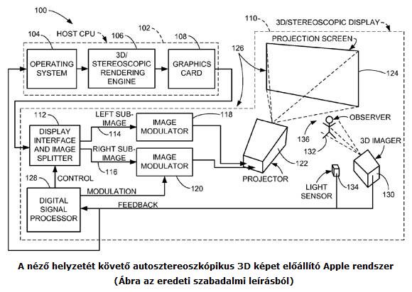 Az Apple szabadalmilag védett rendszere egyidejűleg több néző számára, azok helyzetét érzékelve, egy speciális vetítőernyőre vetíti az autosztereoszkópikus 3D képet.