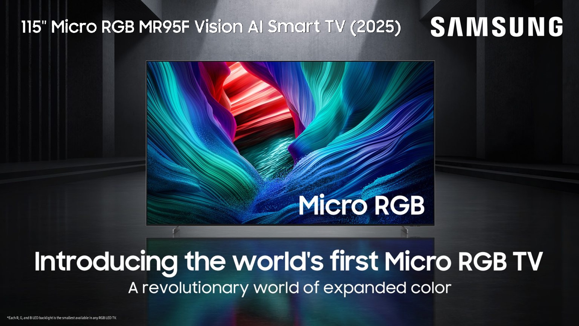 A 291 centis (115”) Samsung MR95F Micro RGB TV világelső képernyőjének mikroméretű RGB LED háttérvilágítása kivételes színpontosságot ígér.