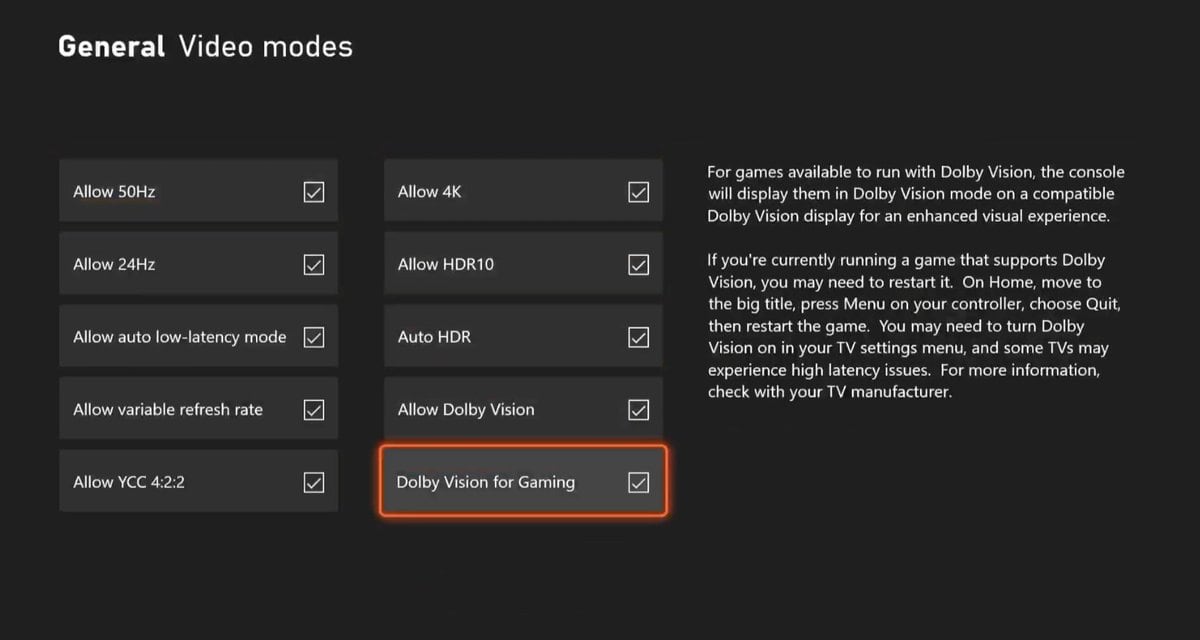 Az Xbox Series X/S konzolokon a Dolby Vision kompatibilis az olyan újgenerációs játékfunkciókkal, mint a 120 képkocka/sec, a változó képfrissítési gyakoriság (VRR), a virtuális 3D környezetbeli fényút modellezés (raytracing) és az automatikus alacsony késleltetési mód (ALLM) kapcsolás. A konzolok már eddig is támogatták az alap HDR10 formátumot, s vele a kibővített fényesség- és színtartományt. Az Xbox One, Xbox One S és Xbox One X konzolokon azonban nem támogatott a Dolby Vision játék.