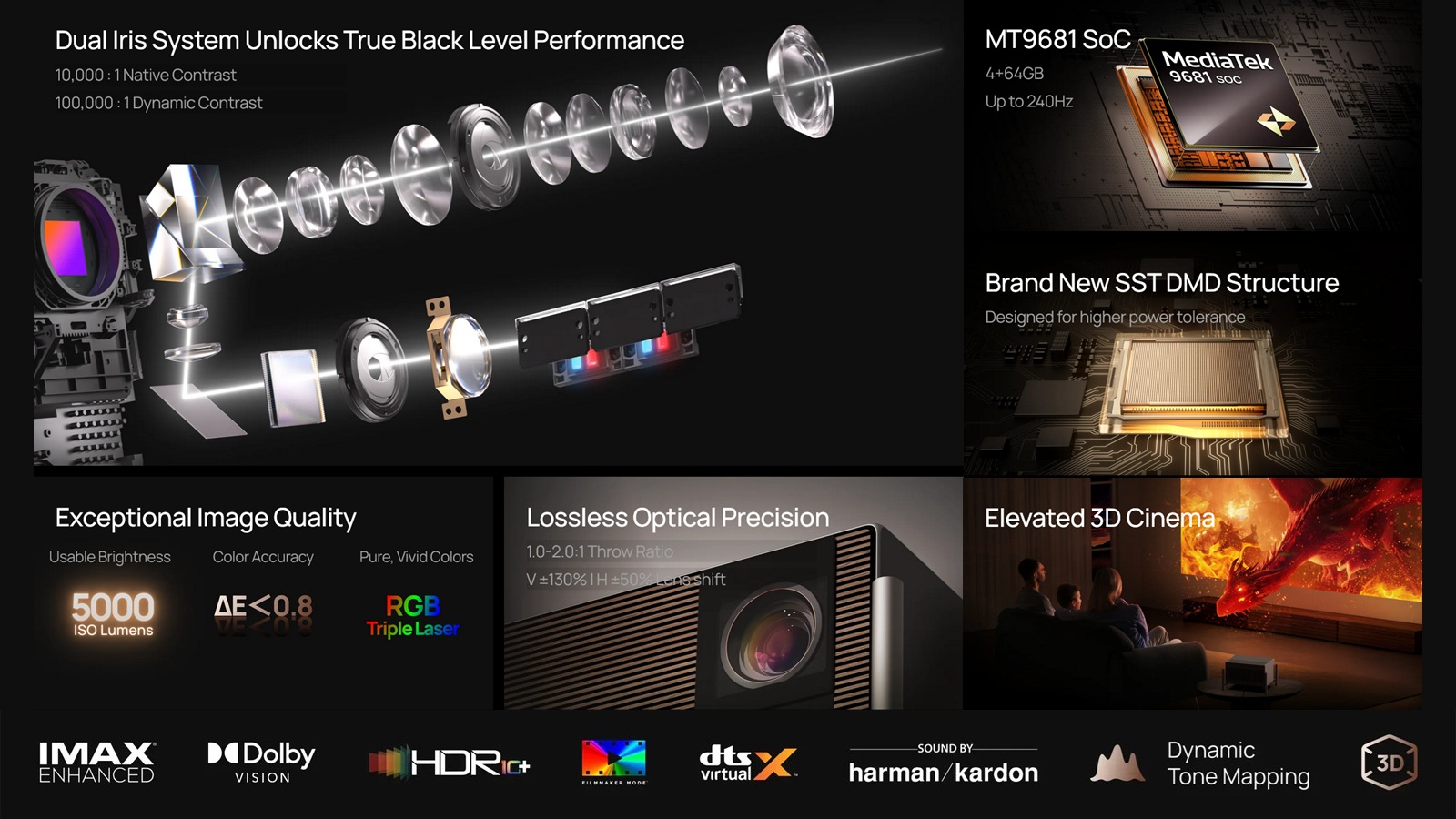 A projektor lelkét az XGIMI szerint eddigi legfejlettebb dinamikus „Dual Iris” rendszerük adja. Ez egy külön fényrekesszel kontrollálja a vörös, zöld és kék lézerdiódákból álló „RGB Triple Lazer” fényforrás fényét, egy másikkal a lencserendszeren átjutó fénymennyiséget szabályozza. Már a 10.000:1 specifikált kontrasztarány is mélyebb feketéket vagy fényesebb kiemeléseket ígér, jelentősen javítva a valós vizuális élményt.